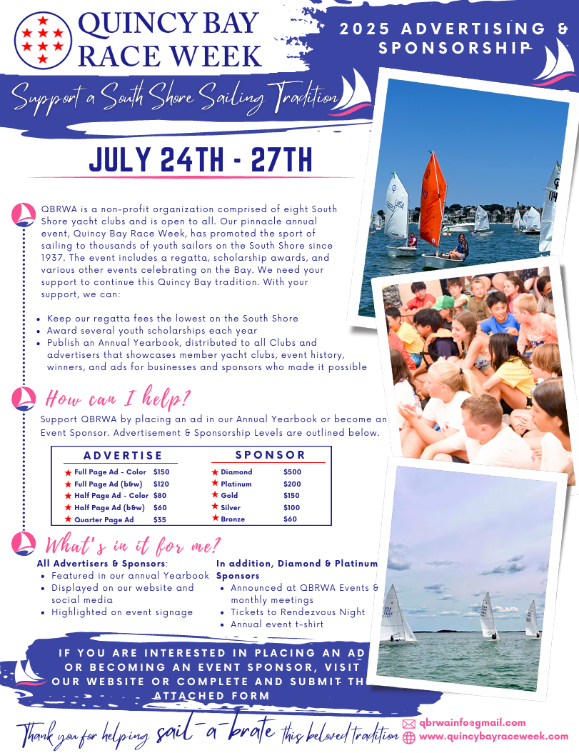 Introduce your brand to the Quincy Bay Race Week Association community and captivate our devoted audience with your message! See below for Yearbook Ad & Website package rates!